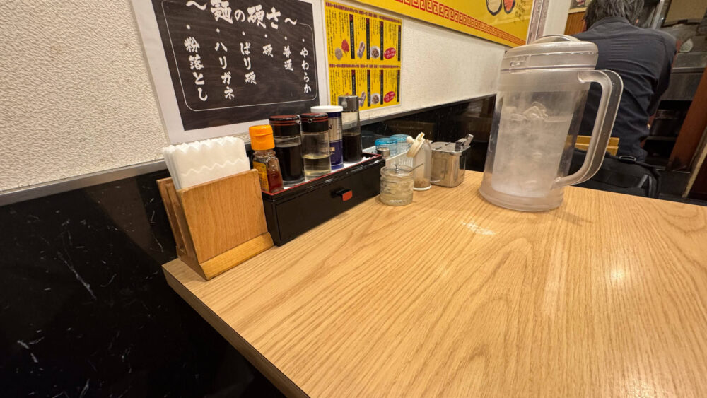 ▲卓上にはかえし、ラー油、お酢、胡椒、ニンニク、すりごま、辛子高菜などの豊富なラインナップ。