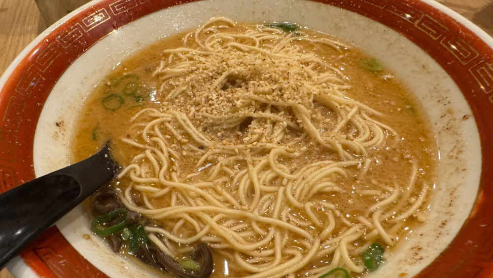 ▲替玉をスープに入れ、卓上のすりごまで香ばしさをプラス。これまた美味しい。