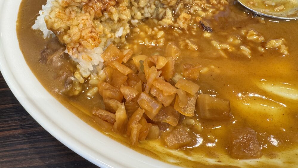 ▲卓上の福神漬けも投入し味変。ココイチの福神漬けは味も食感もちょうど良くて美味しい。