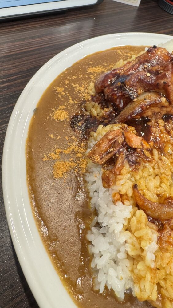 ▲続いて、卓上のとび辛スパイスで味変。ルーをピリ辛に変化させ、終盤もラストスパートしていきます。