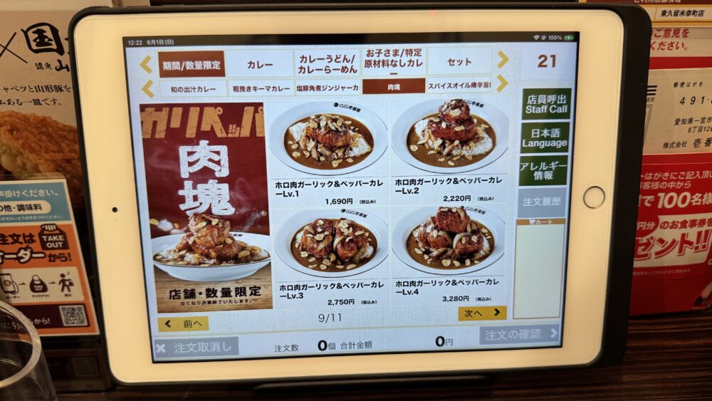 ▲メニューから注文します。こちらの店舗はiPadですね。