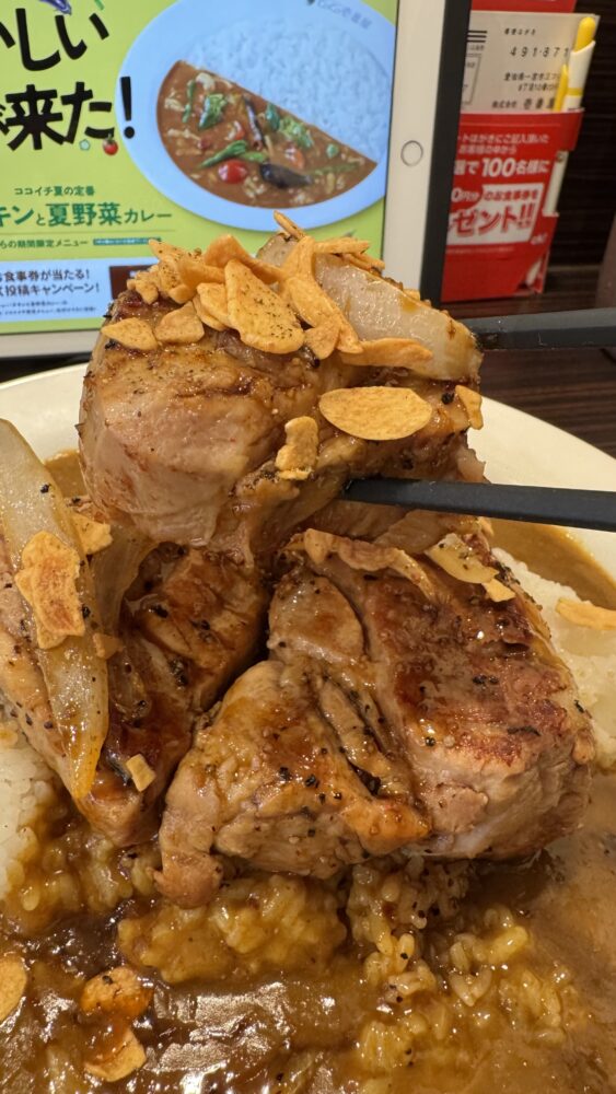 CoCo壱番屋のホロ肉ドカンとガーリック&ペッパーカレー肉塊LEVEL4は、甘辛い醤油ソースが効いたホロ肉が大量にあって、王道のカレー部分と交互に食べるのが楽しい一皿でした!
