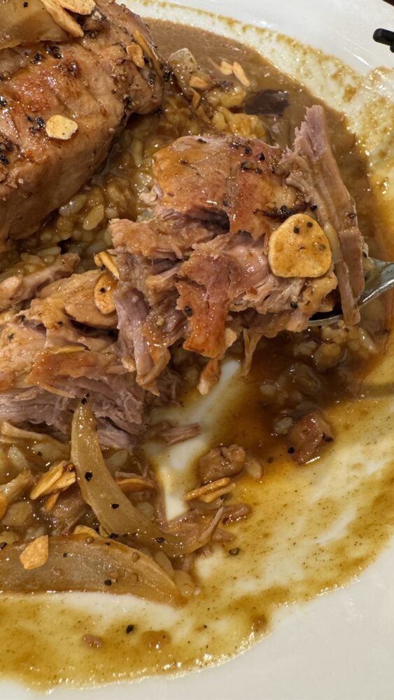 ▲肝心のホロ肉は、ベースの醤油ソースに加え、ガーリックチップと胡椒がかかっていて旨い。