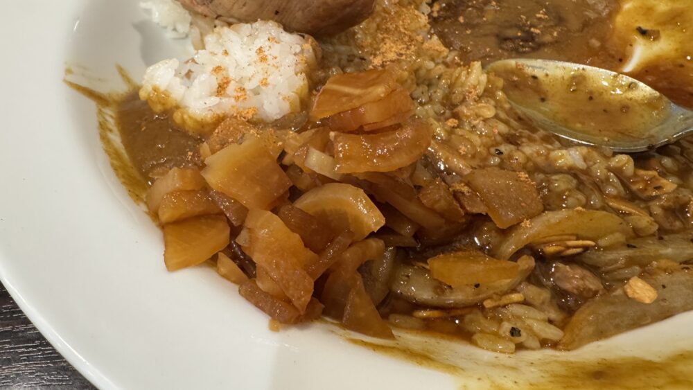 ▲続いて、卓上のとび辛スパイスで味変。カレー・ホロ肉どちらもピリ辛になって最後まで美味しい。