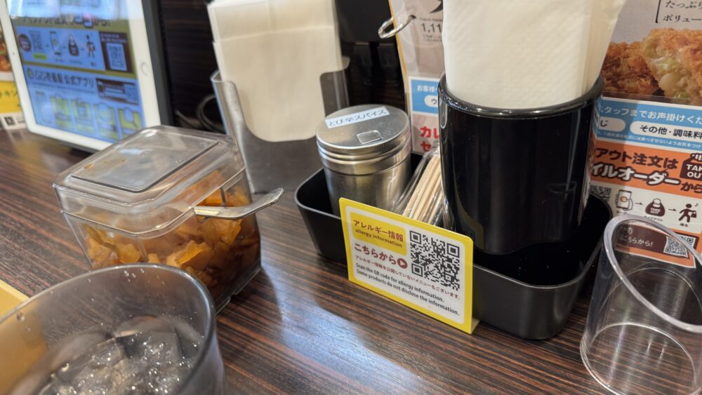 ▲卓上調味料はとび辛スパイス、福神漬け。ソース・塩が欲しい方は店員さんへお願いすれば提供してもらえるとのこと。