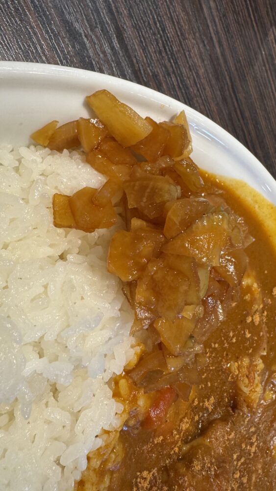▲卓上の福神漬けも投入し味変。冷たくてポリポリ食感で良いアクセント。