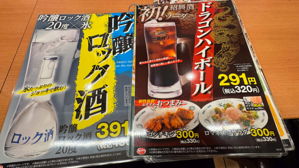 ▲上が麺・定食・飯などのメニュー、下が新しいドリンクメニューです。