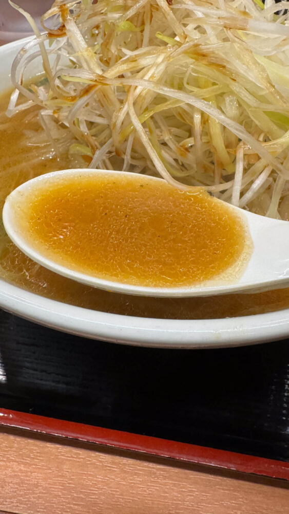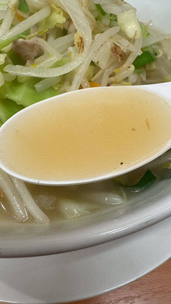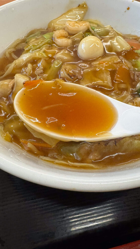 ▲スープは醤油ベース。あんかけの部分も混ざると、とろみと旨味が加わって美味しい。