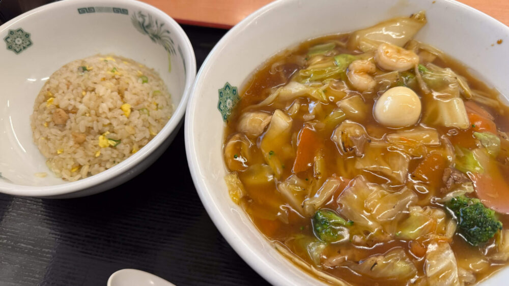 五目あんかけラーメン+麺の大盛+半チャーハン(2024年1月中旬)