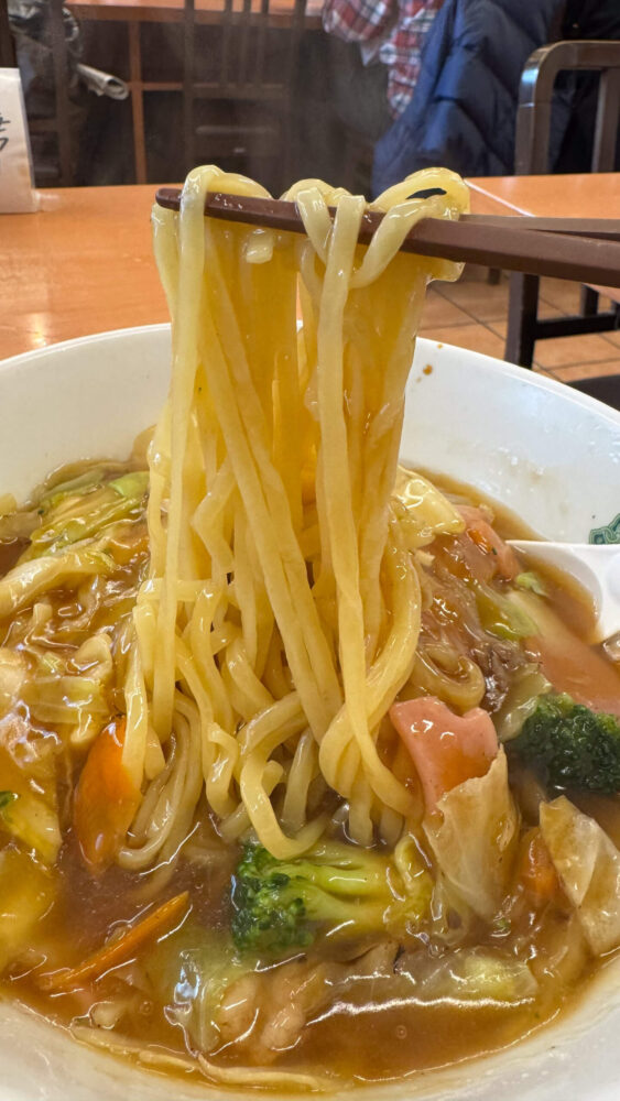 ▲モッチリ麺にあんかけが絡みまくって旨し。あんかけがアツアツなので、寒い日にはうってつけですね。