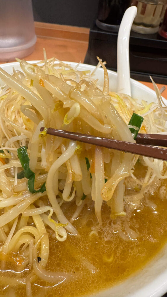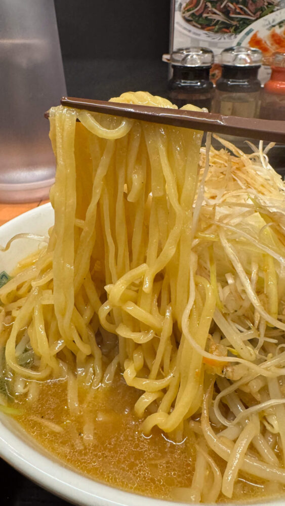 ▲モッチリ麺は味噌スープを持ち上げてくれるて美味。ネギと一緒に食べても良き。