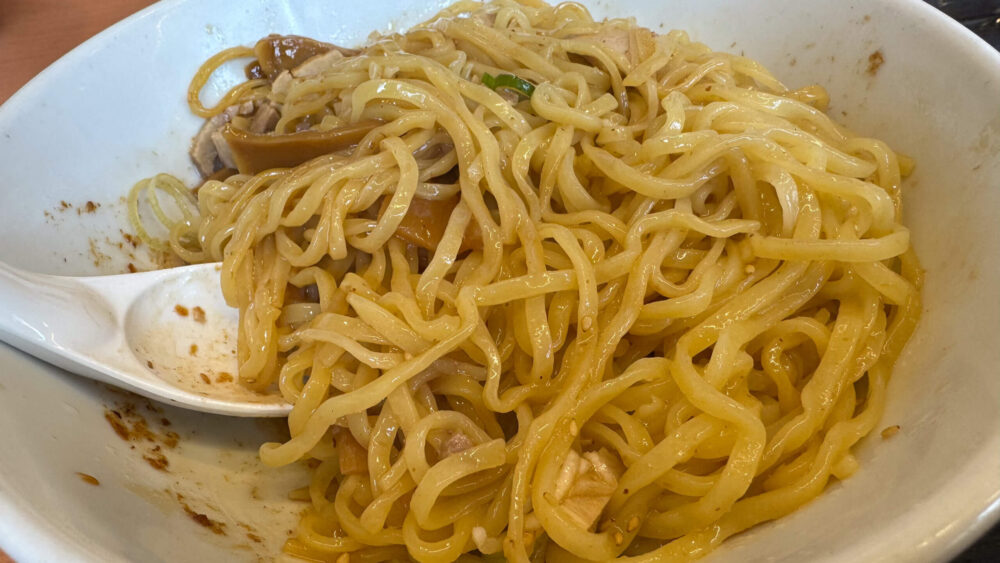 ▲どんぶりの底にタレがあるので、麺とタレと具材をしっかり混ぜ合わせていきます。
