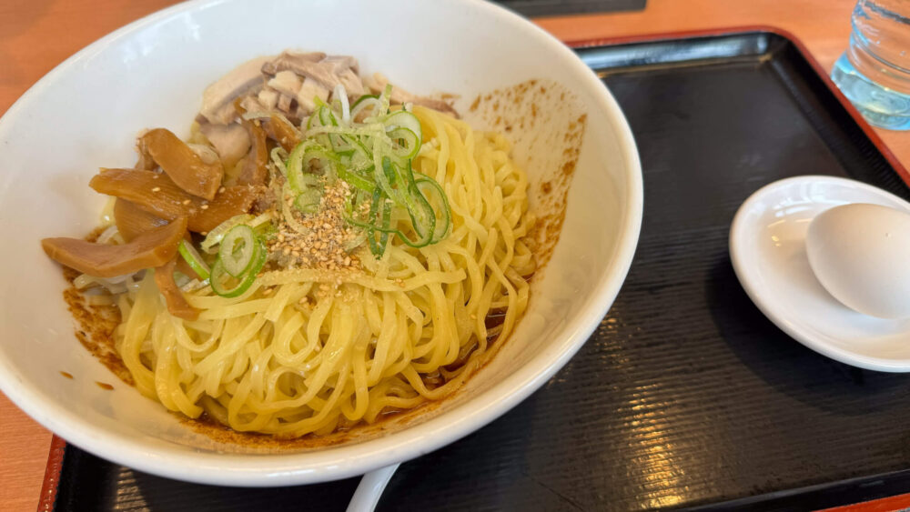 汁なしラーメンが着丼!麺の上にチャーシュー、メンマ、ネギ、すりごまというシンプルな構成。温泉玉子は別皿提供です。