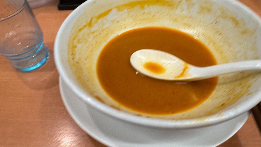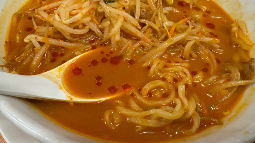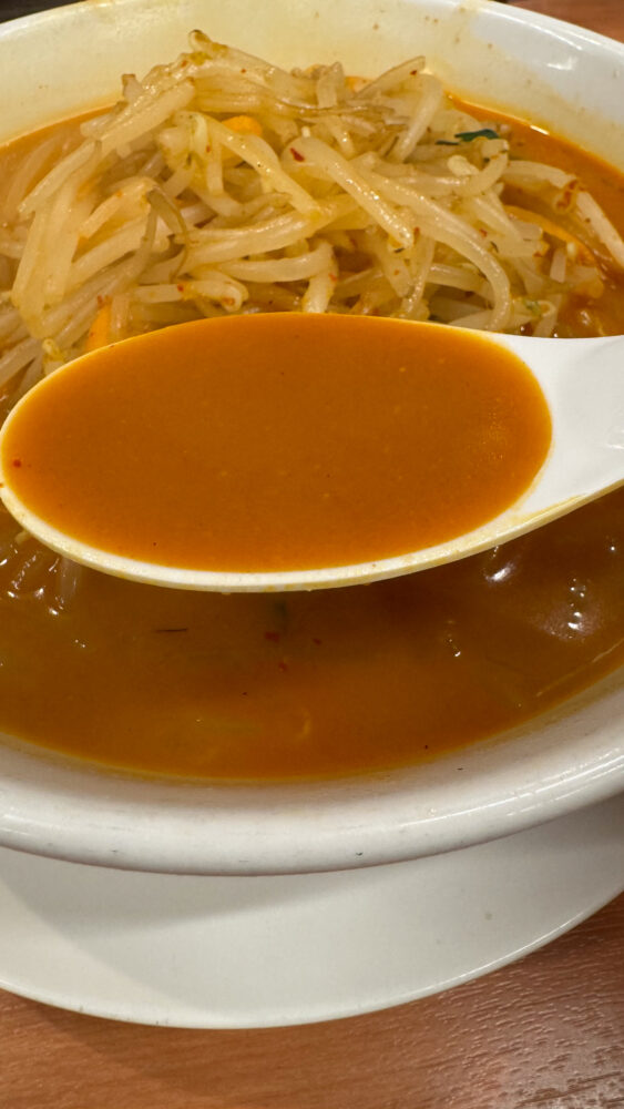 ▲スープはピリ辛なとんこつ味。ベース部分は動物系のコクを感じます。