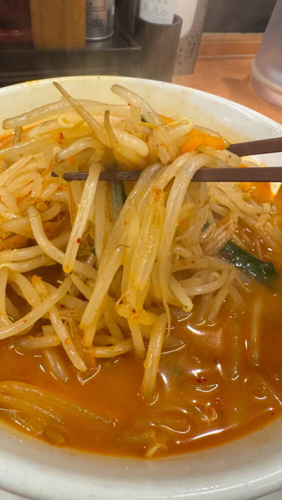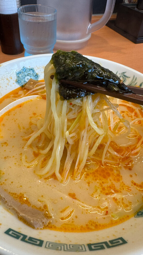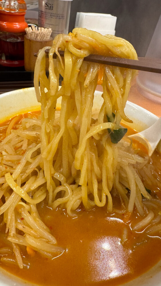 ▲スープはピリ辛な味噌。寒い時期に食べたくなる味わいで美味。