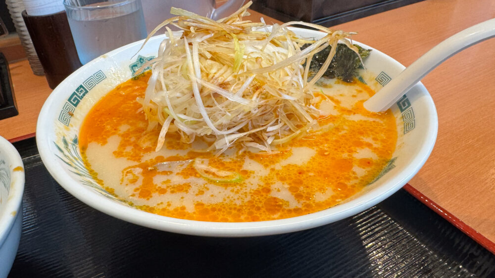 ピリ辛とんこつネギラーメンが着丼!スープがけっこう赤め。ネギは別皿提供です。