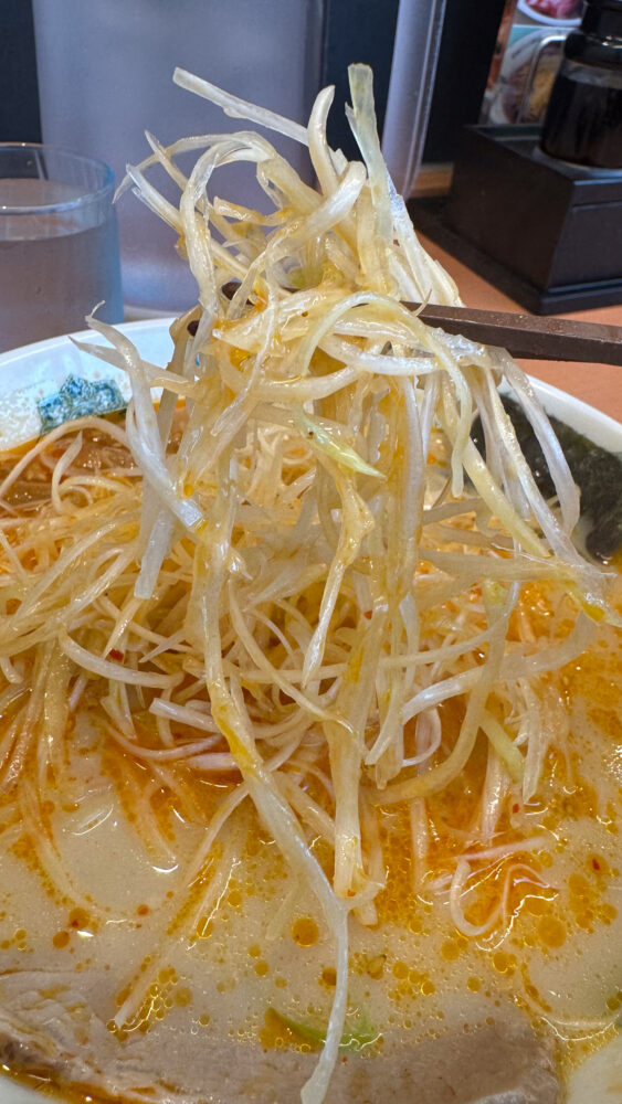 ▲ネギはタレがかかってシャキ食感で美味。ピリ辛とんこつスープと合います。