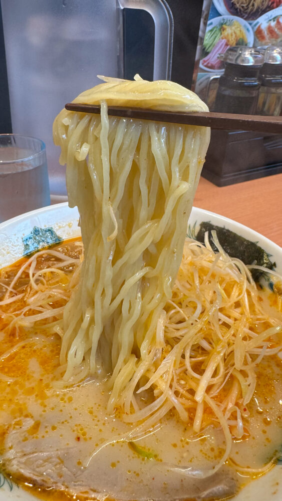 ▲麺はいつものタイプですが、とんこつ系なのに細麺じゃないのは珍しいですね。とんこつスープにもマッチして美味。