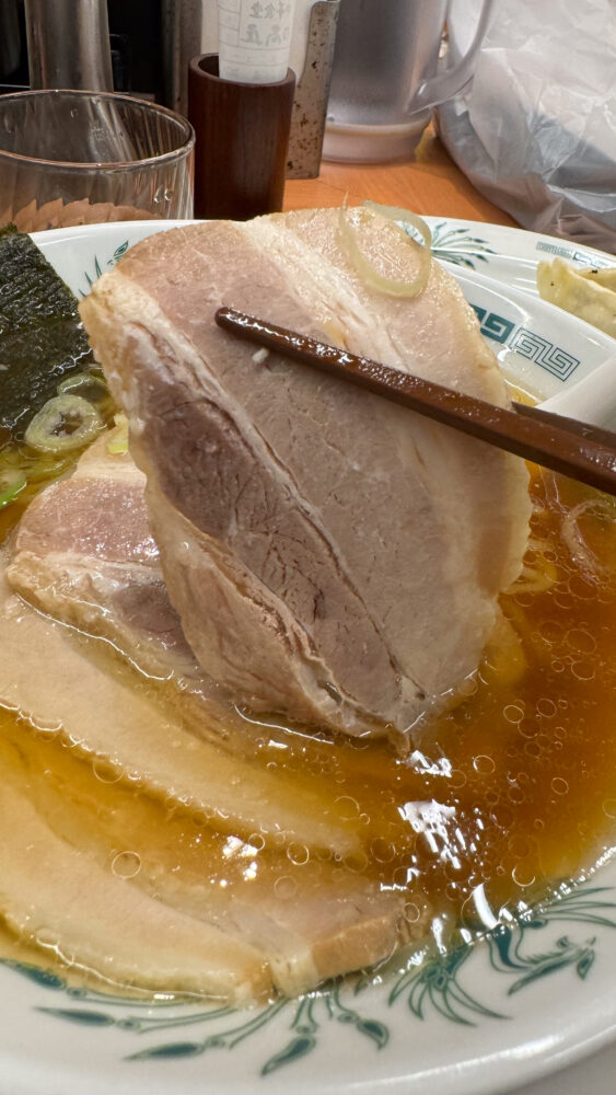▲チャーシューは柔らかく煮込まれていて美味。口の中で醤油スープと合わせるとより旨し。