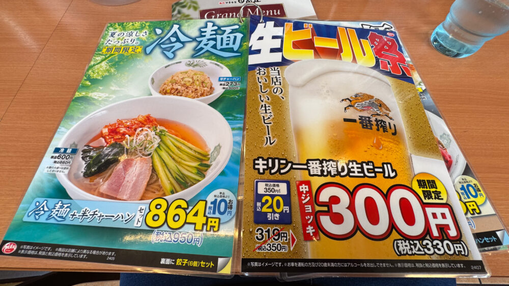 ▲上が麺・定食・飯などのメニュー、下が期間限定の冷麺のメニューです。