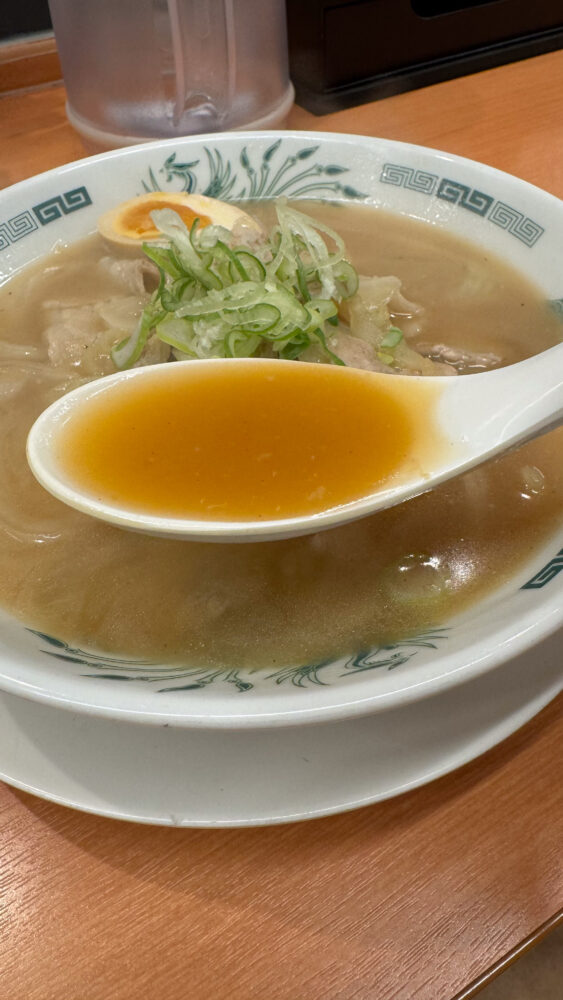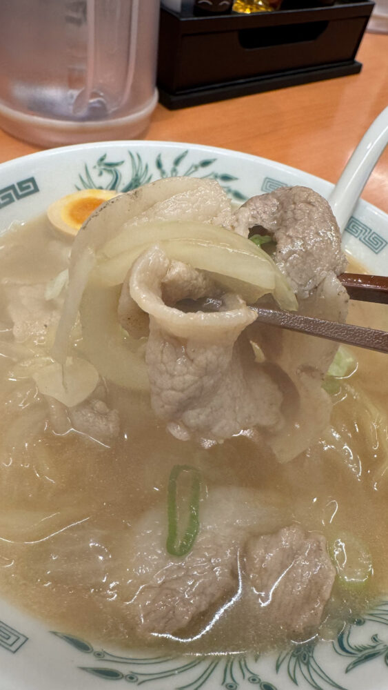 ▲スープは、醤油ベースですがけっこう甘め。豚肉と玉ねぎの甘さを感じます。
