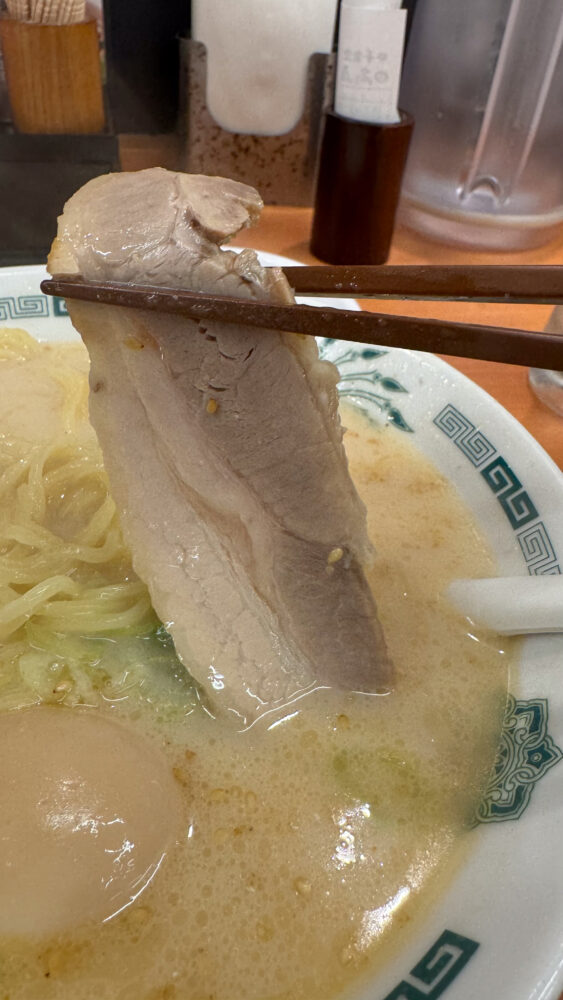 ▲チャーシューは1枚。豚骨スープに浸して食べると味が濃くなって美味しい。
