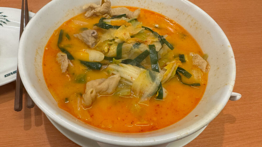 ▲麺はモチっとした食感。ピリ辛スープをまとって辛旨。白菜やニラ、人参、ネギなどの野菜も多いのでボリューム満点。