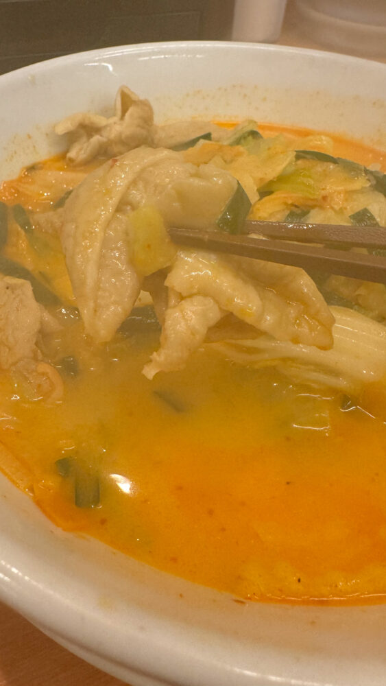 ▲モツは、弾力強めでピリ辛なスープに合いますね。たっぷりあるので食べ応えもバッチリ。