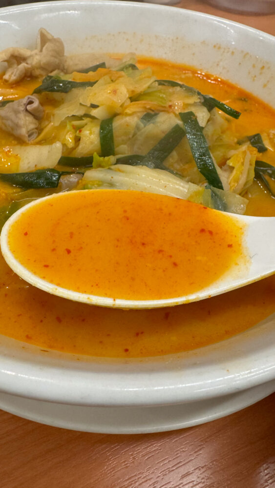 ▲スープは、ピリ辛で辛旨。豚骨ベースに秘伝の辛味噌を混ぜ合わせたものとのこと。