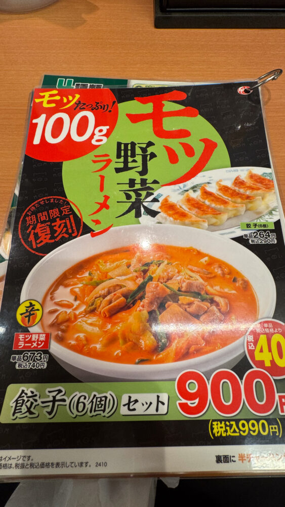注文はモツ野菜ラーメン餃子(6個)セットで税込990円でした。