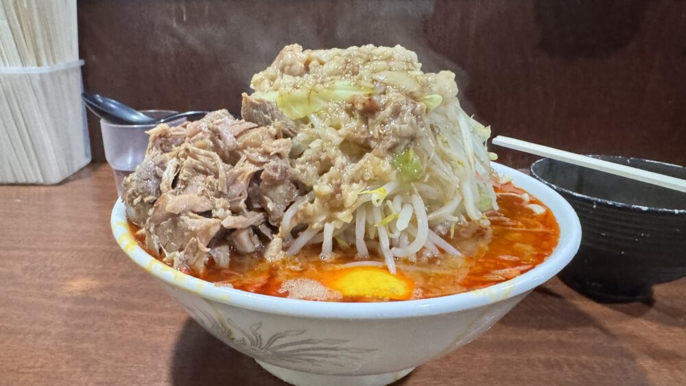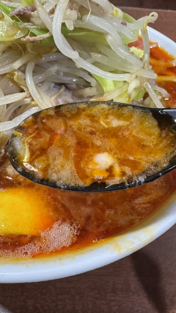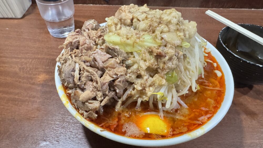 「トムヤムクン(ヤサイアブラマシマシカラメ)+ほぐし豚+生卵」を実食!