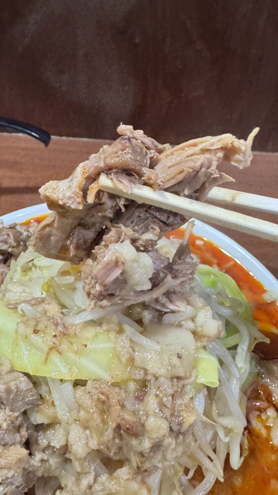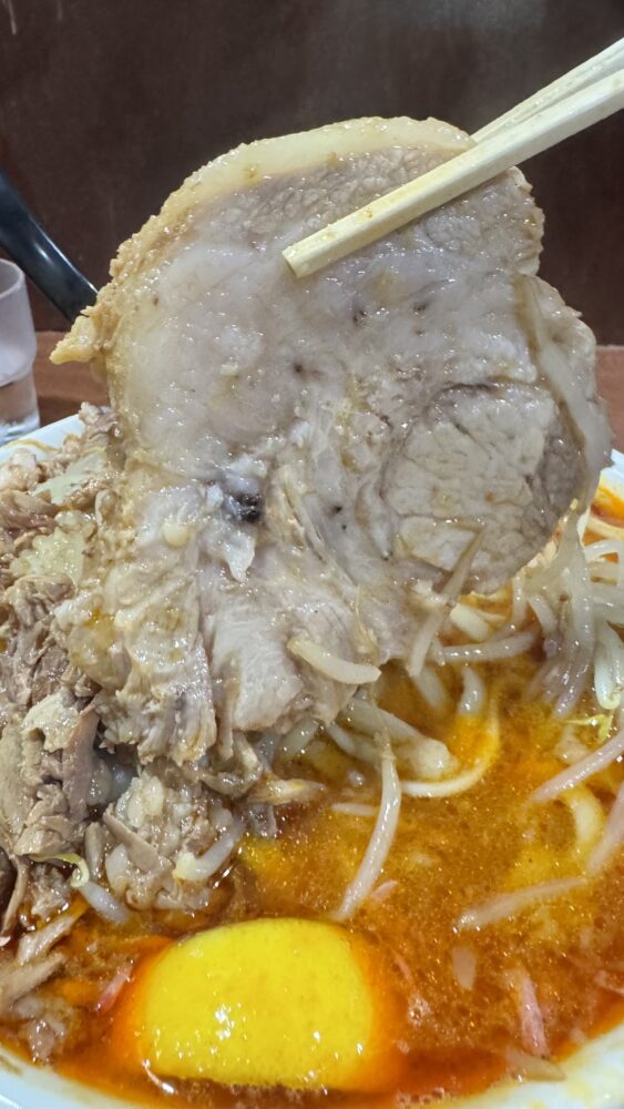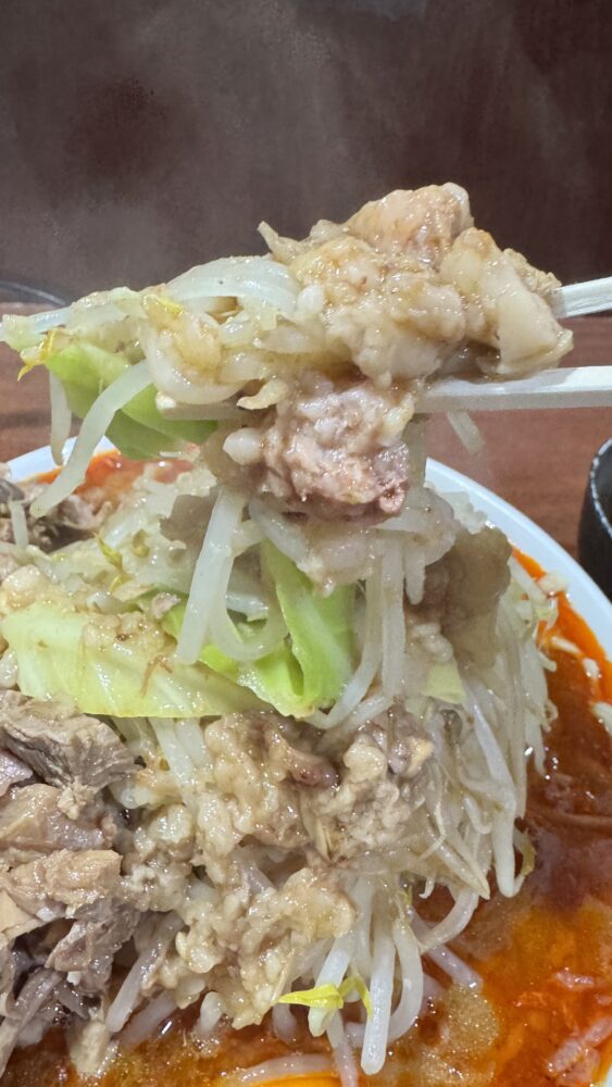 ▲横から見ると、野菜がこんもりで山頂の背脂もたっぷり。ほぐし豚もふんだんに入っています。