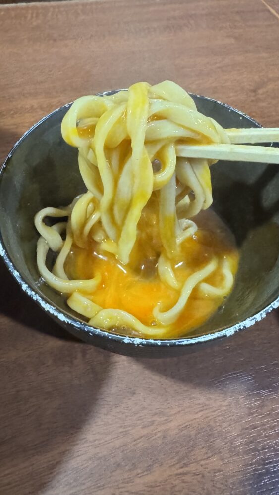 ▲生卵に麺をディップして味変。生卵がトムヤムクンの酸っぱ辛さを包み込んでくれて、良い味の変化。