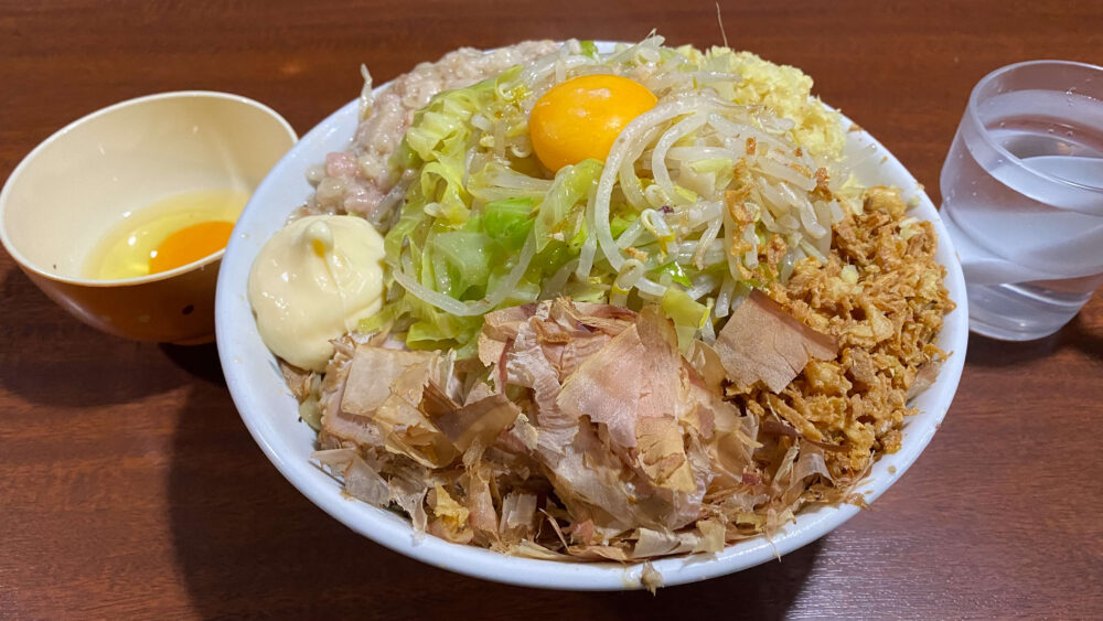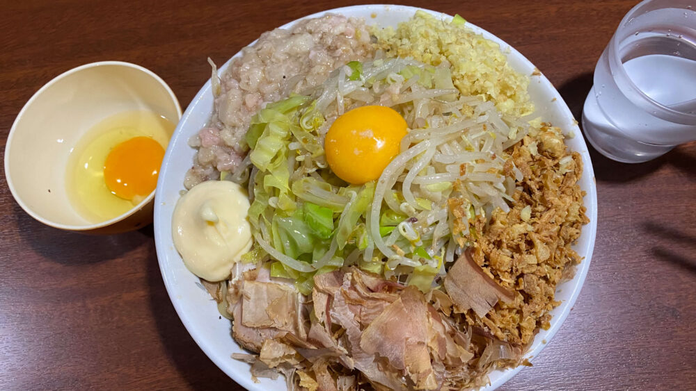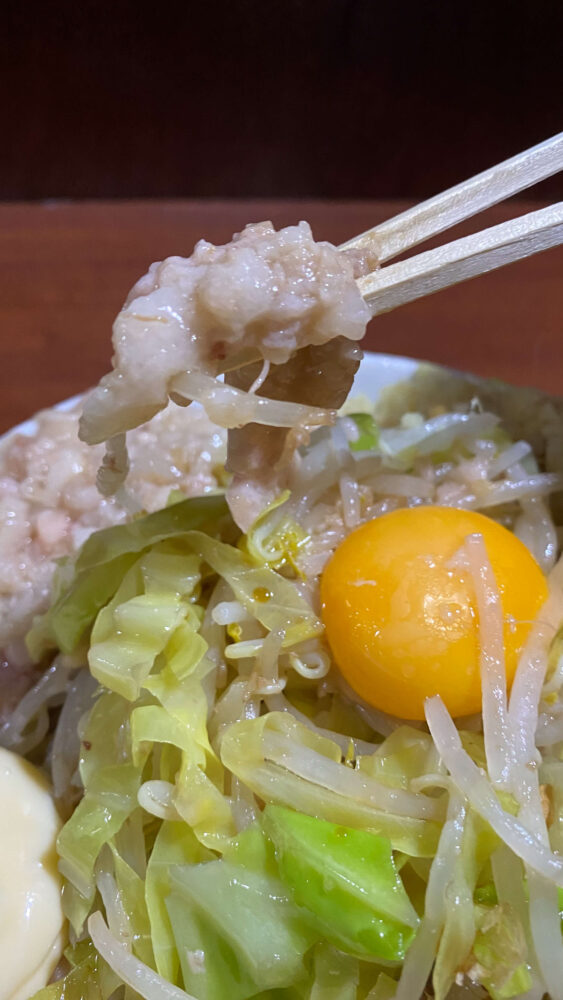「汁無し豚増し(ニンニク以外全部)+生卵+ショウガ」を実食!