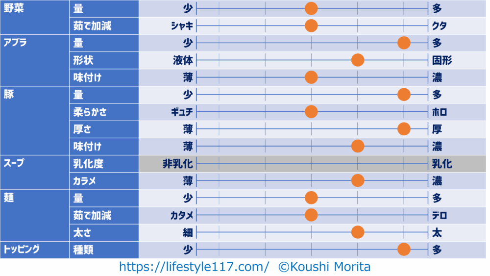 汁なしのため、スープの乳化度はグレーアウトしています。
