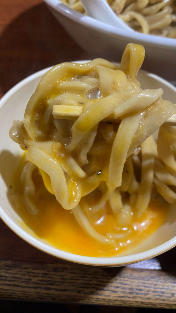 ▲中盤は生卵ですきやき風に味変。すすり心地が良くて食べるペースが加速します。