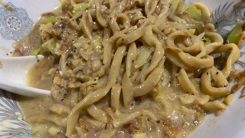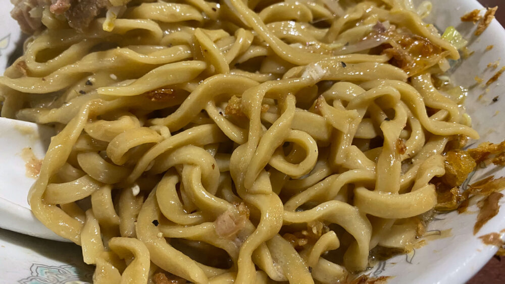 今回は汁無し豚増し+生卵+ショウガを注文しました!