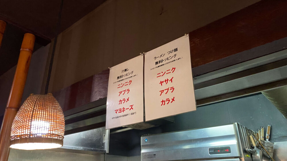 ▲無料トッピングの内容は張り紙を確認しましょう。メニューによって内容が若干違います。