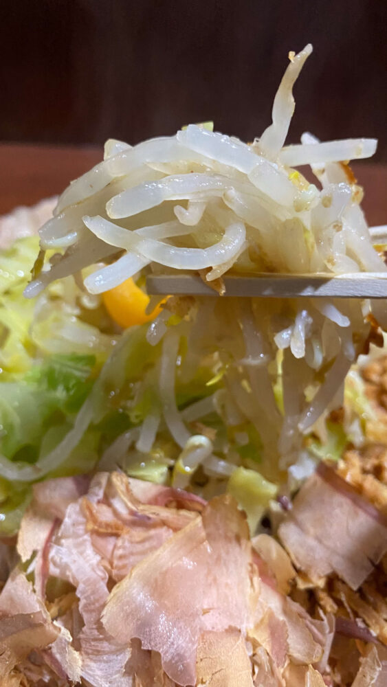 ▲野菜をある程度食べたら、具材と麺を混ぜ合わせ。あえて混ぜムラをつくった方が味のバラツキを楽しめておすすめ。