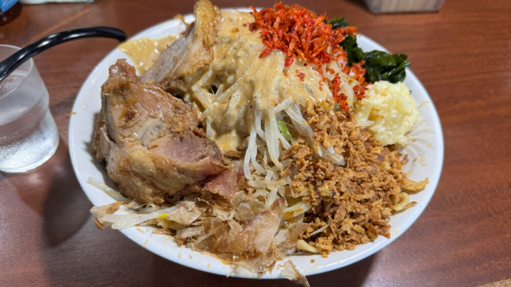 ▲横から見ると、なかなかの標高。具材は、自家製ゴマダレがかかった冷やし野菜に豚、フライドオニオン、鰹節、コーン、わかめ、ニンニク、海老辛。