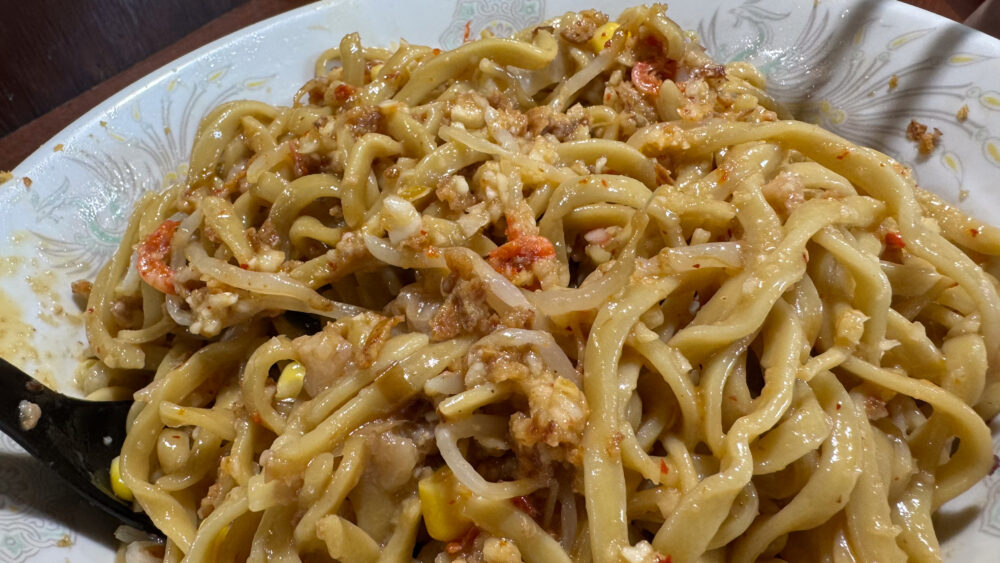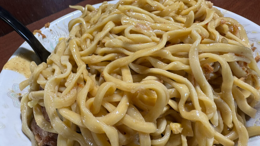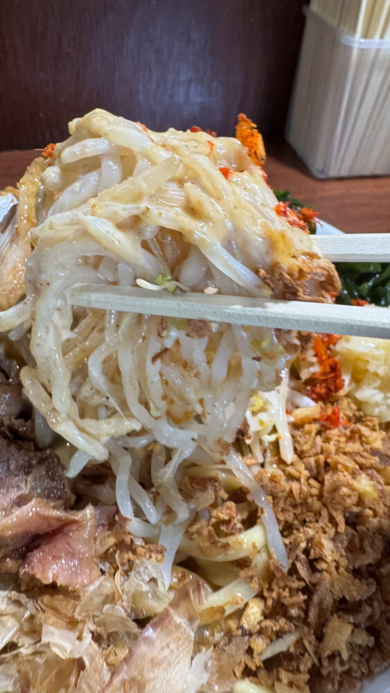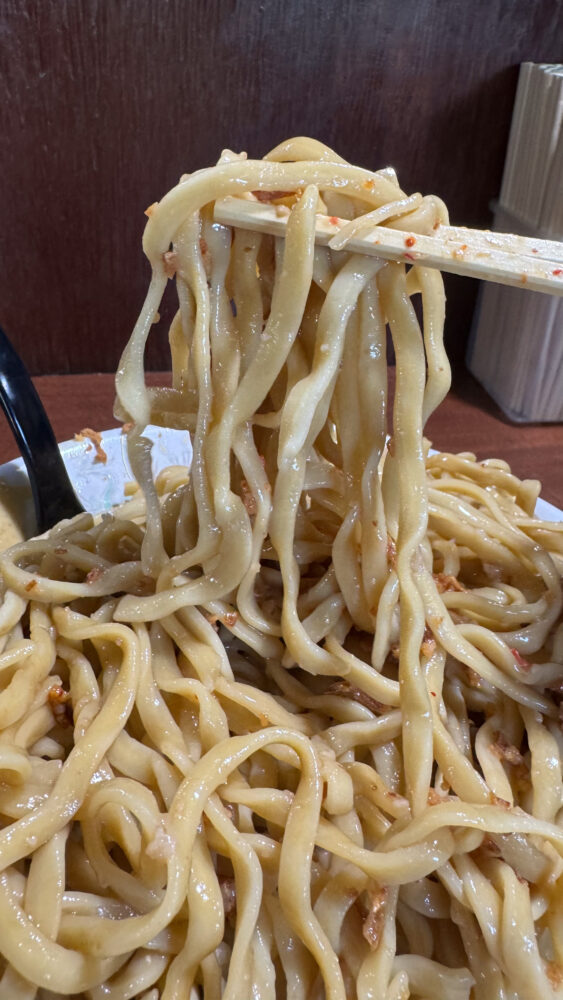▲ある程度上物を食べ終わったら、麺とタレと具材をしっかり混ぜ合わせます。ただし、なるべくニンニクは混ざらないよう避けました。