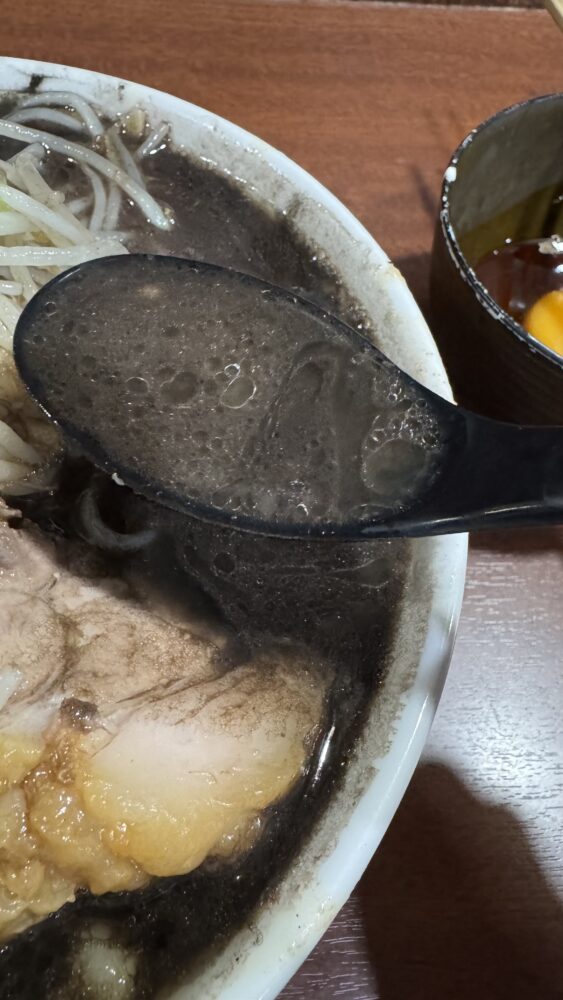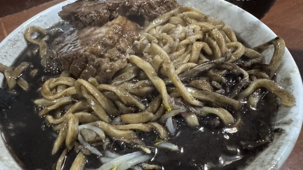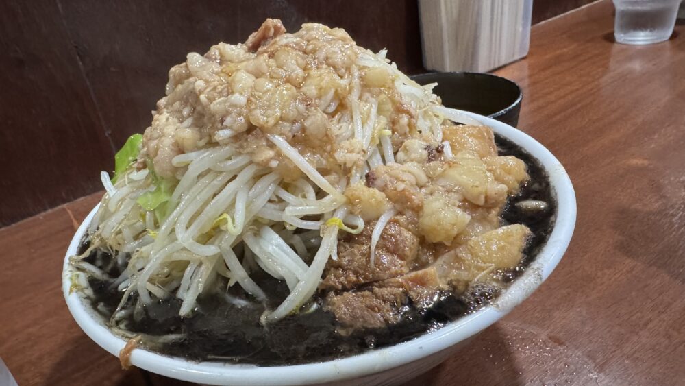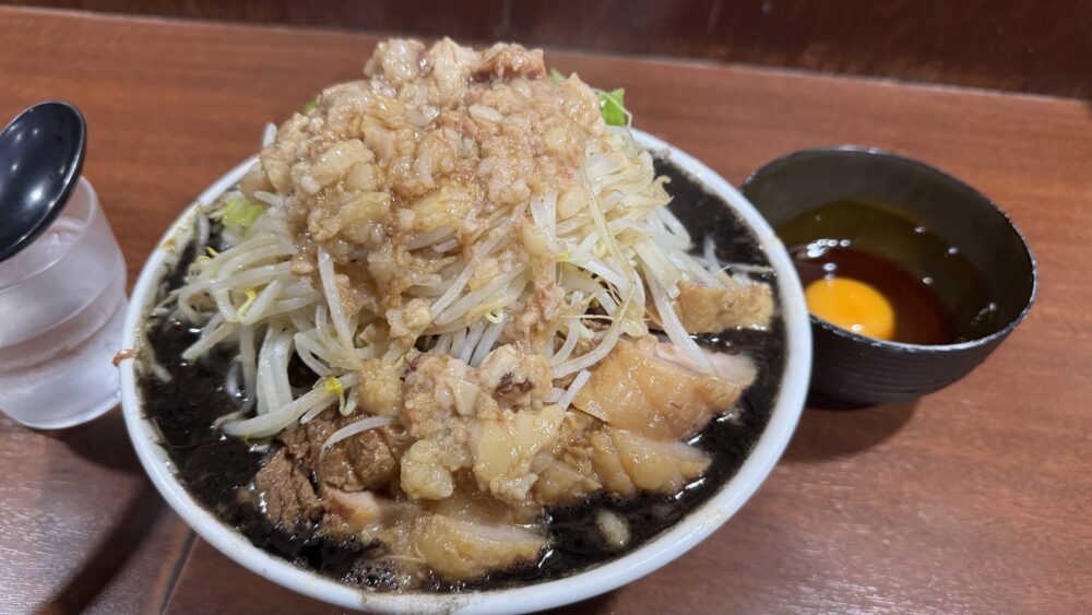 「イカスミラーメン(ヤサイアブラマシマシカラメ)+豚増し+ラー油生卵」を実食!