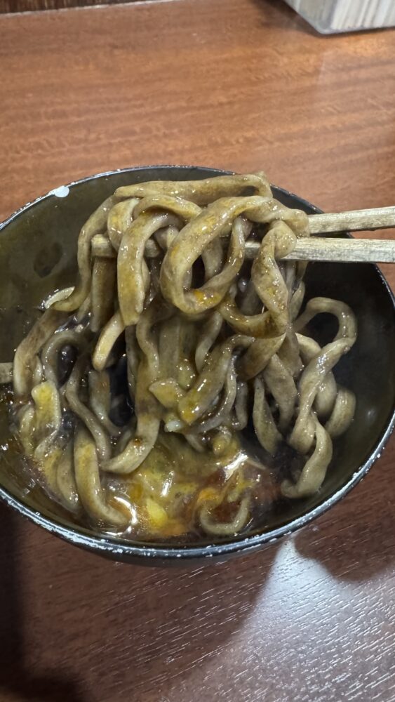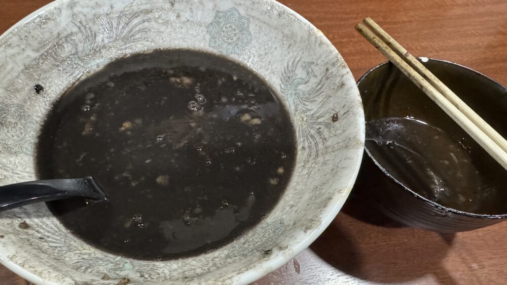 ▲ある程度上物を食べたら天地返し。麺も真っ黒に染まっています。
