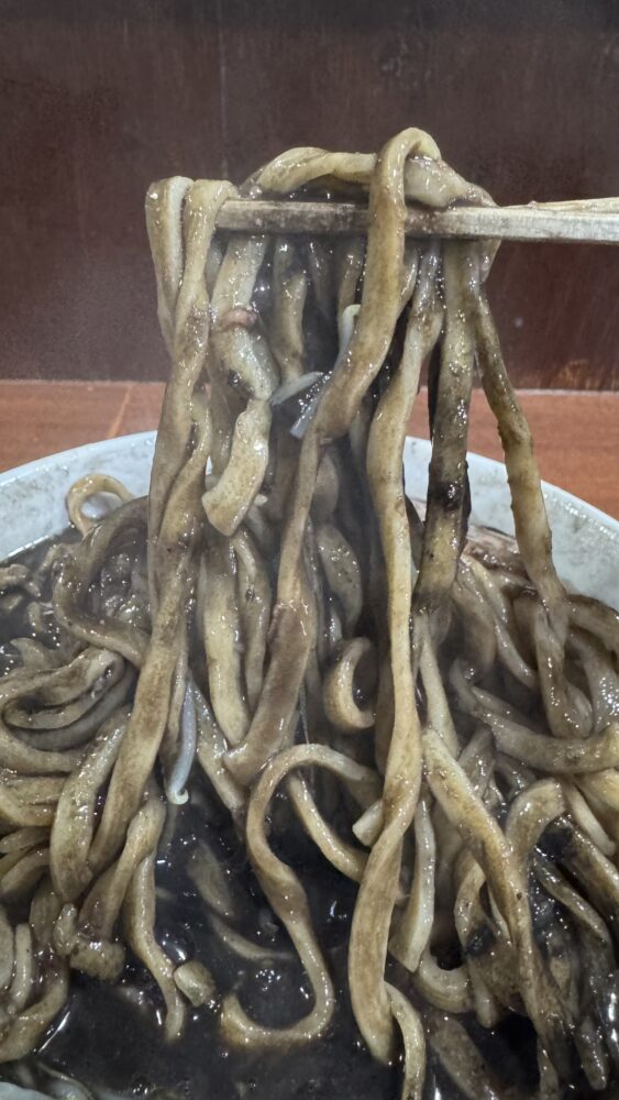 ▲麺は平打ち気味の中太麺。イカスミスープがたっぷり絡んで美味。