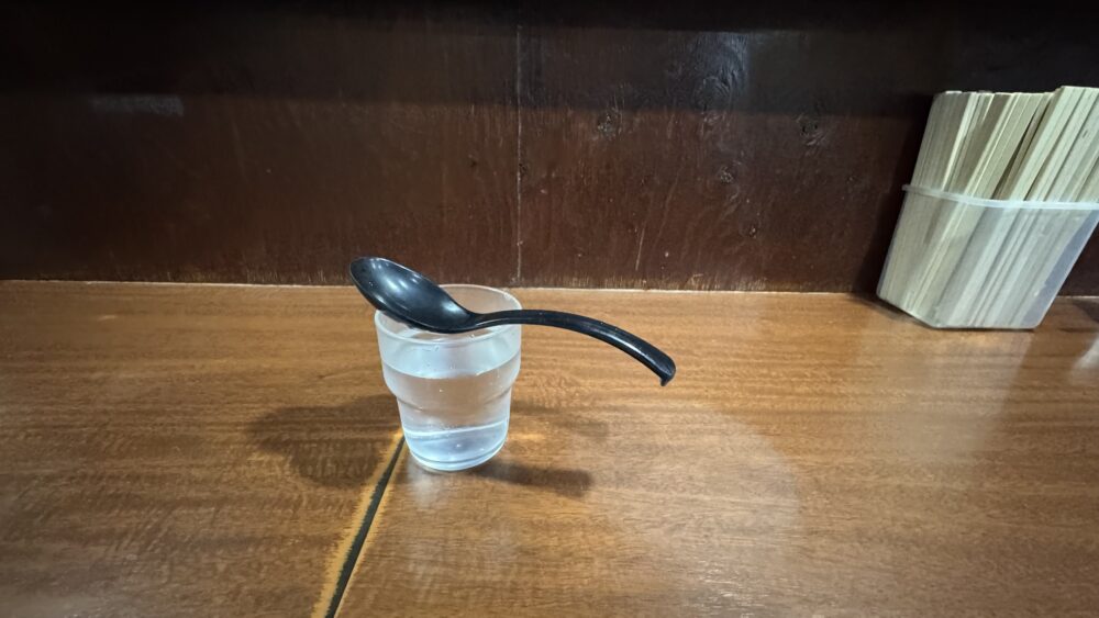 ▲卓上には割りばしのみ。調味料は共用になり、給水機付近にあります。