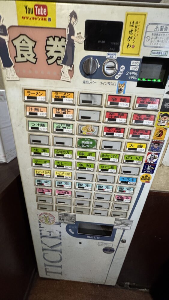 イカスミラーメンは1,350円の「限定」、ラー油生卵は「トッピング100円」の食券をそれぞれ購入でした。
