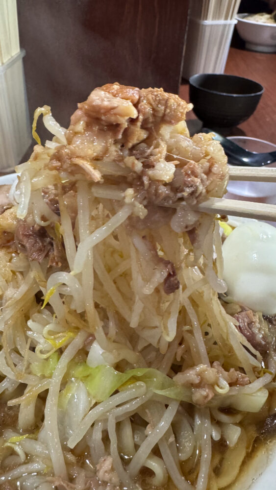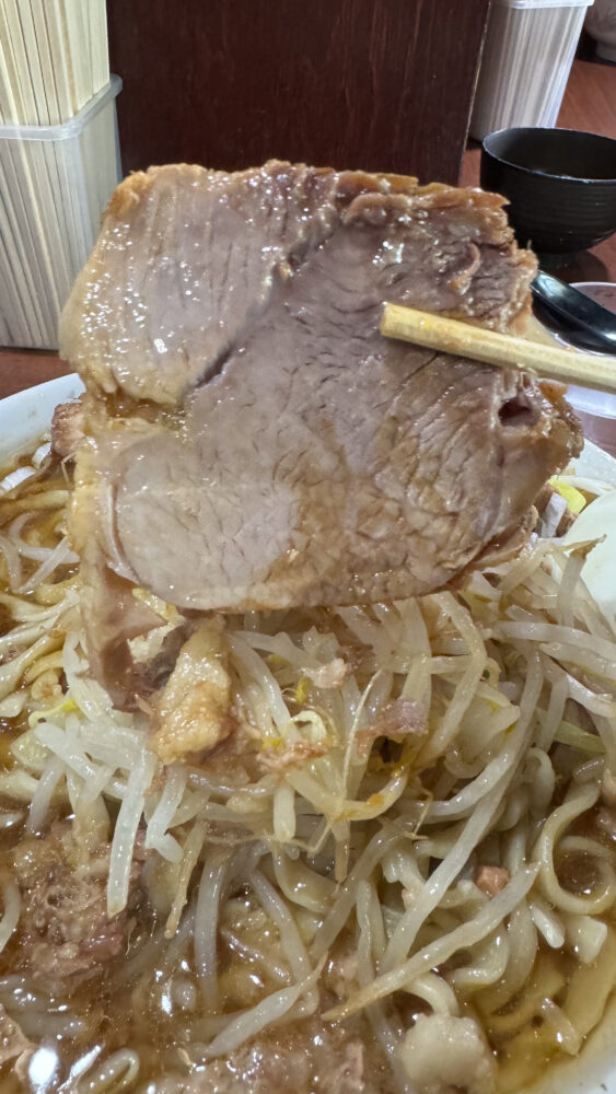 ▲横から見ると、野菜の山頂のアブラがほぼお肉っぽい贅沢仕様。ふもとの豚もぶ厚い。