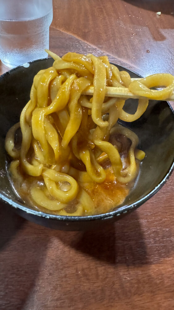 ▲麺は平打ちっぽい中太。漆黒スープが染みて美味しいです。
