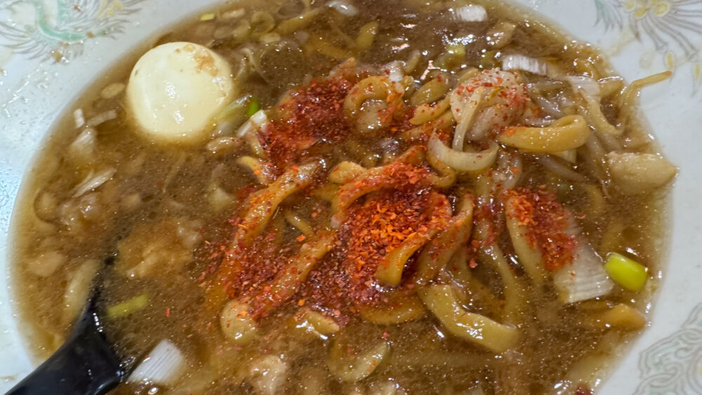 ▲終盤は、唐辛子で味変。醤油が強いので唐辛子が合います。辛さブーストで終盤もペースをキープ。