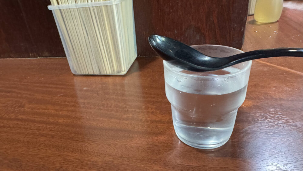 ▲卓上には割りばしのみ。調味料は共用になり、給水機付近にあります。